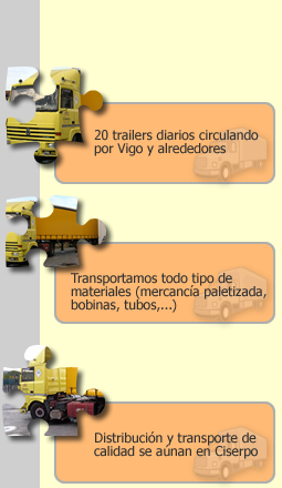 |  | Trailers y camiones rígidos de entre 5 y 12 Tm. Toda una flota de vehículos destinados a hacer todo tipo de entregas (cargas indivisibles, fraccionadas, paquetería industrial), ganando en rapidez, eficacia, coordinación y precio, siendo uno de nuestros puntos fuertes la cobertura de urgencias. | | Cada día Ciserpo realiza circuitos cerrados desde nuestras instalaciones, abarcando toda el área industrial de Vigo, así como los alrededores. Gracias a las excelentes condiciones de nuestros almacenes, los materiales están protegidos de cualquier tipo de deterioro, y a su situación estratégica el proceso se completa con un transporte y distribución de excelente calidad y eficiencia |  | |  | | |